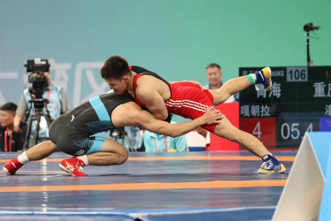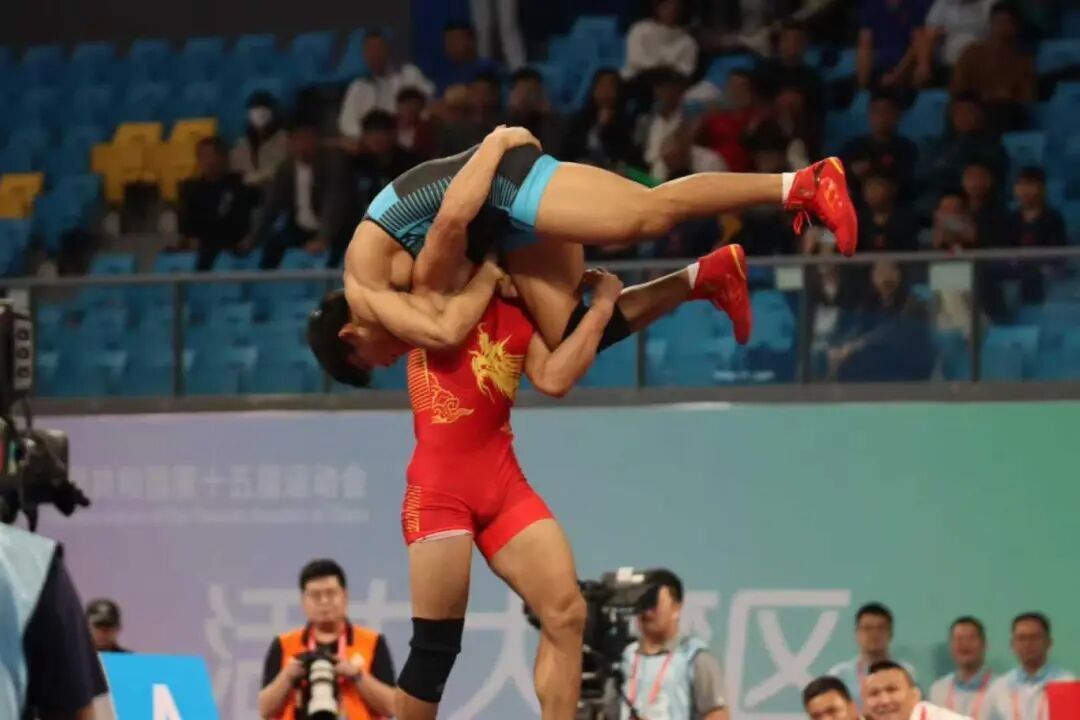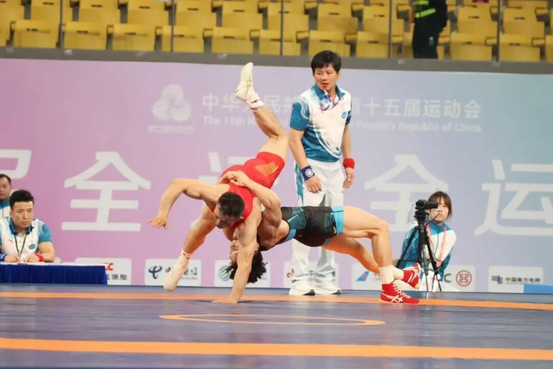 “快看!红方选手这个抱摔太漂亮了!”随着裁判一声哨响,男子古典式摔跤77公斤级比赛正式开始,来自山东队的选手与内蒙古队选手展开激烈对抗——双方时而俯身缠斗、时而迅猛出击,场馆内的加油声此起彼伏。